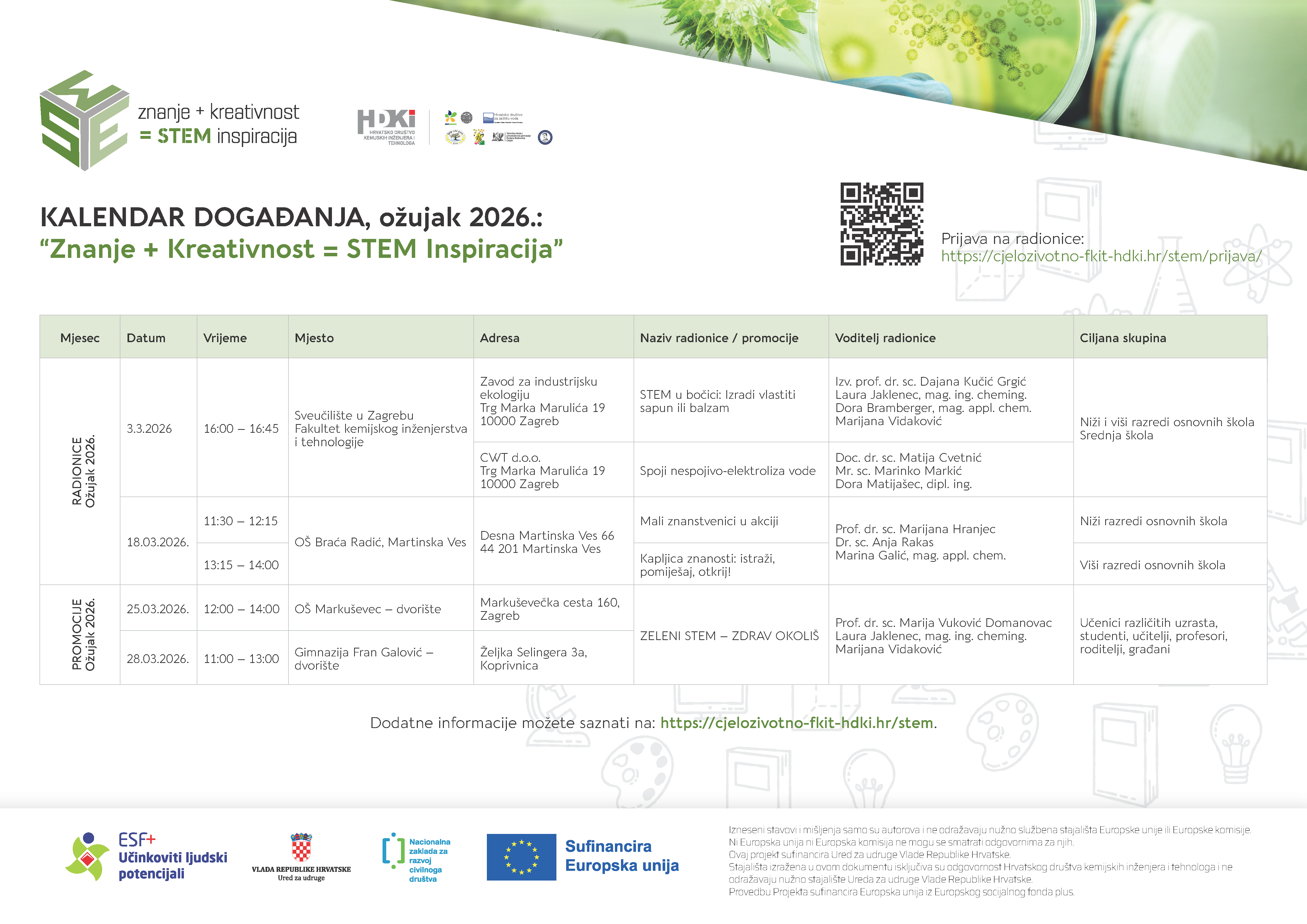 U sklopu projekta „Znanje + Kreativnost = STEM Inspiracija“ objavljen je novi kalendar događanja za ožujak koji obuhvaća niz besplatnih radionica i promotivnih aktivnosti usmjerenih na popularizaciju STEM područja.