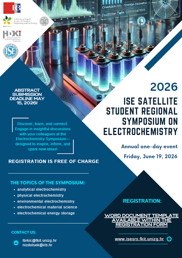 Zadovoljstvo nam je pozvati Vas na 15. po redu ISE simpozij mladih elektrokemičara koji će se održati u petak, 19. lipnja 2026. na Sveučilištu u Zagrebu Fakultetu kemijskog inženjerstva i tehnologije u Zagrebu.